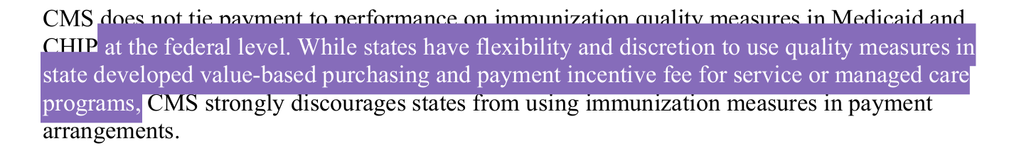 What they’re trying to say is after the update, we discourage payments tied to performance at any level. Medicaid is administered by the state. You cannot access it at the federal level. When I worked in the state of Arizona, there was an Arizona Medicaid. Every state has their own medicaid program. The statement is technically true only because they included “at the federal level”. Had they omitted that part, it would be a lie. Payment is absolutely tied to performance at both federal and state levels. HHS may have announced an intention to end vaccination incentives. Yet, payment to performance remains. Allow me to break it down.