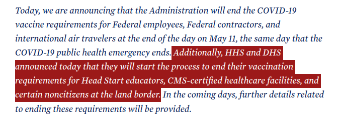 Does the HHS announcement remove the requirement for healthcare workers to be vaccinated as a condition of employment? The policy should have stopped when CMS was told it does not have the authority to mandate vaccination as a condition of hire by the Supreme Court. CMS paused the program for one year after that.