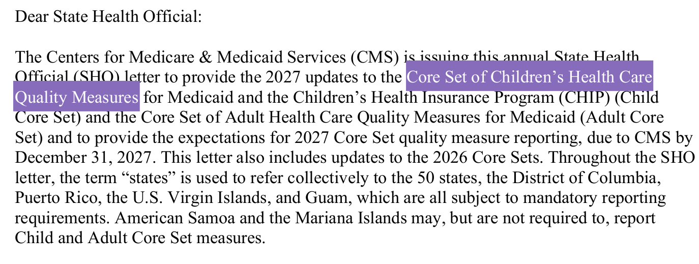 On the first page, I'd like to draw your attention to the fact that it says quality measures. We're going to get into the quality measures quite a bit. CMS has issued this state health official letter to provide 2027 updates to quality measures for both adult core sets and child core sets for the Medicaid and CHIP programs. Quality measures are data points within a medical record that are used to determine health outcomes and ensure providers adhere to a certain quality standard. Core sets are a list of data points that are extracted for quality reporting purposes. The two terms are almost synonymous with little differences between the two. It's not just about monitoring quality, it's also about incentivizing behavior.