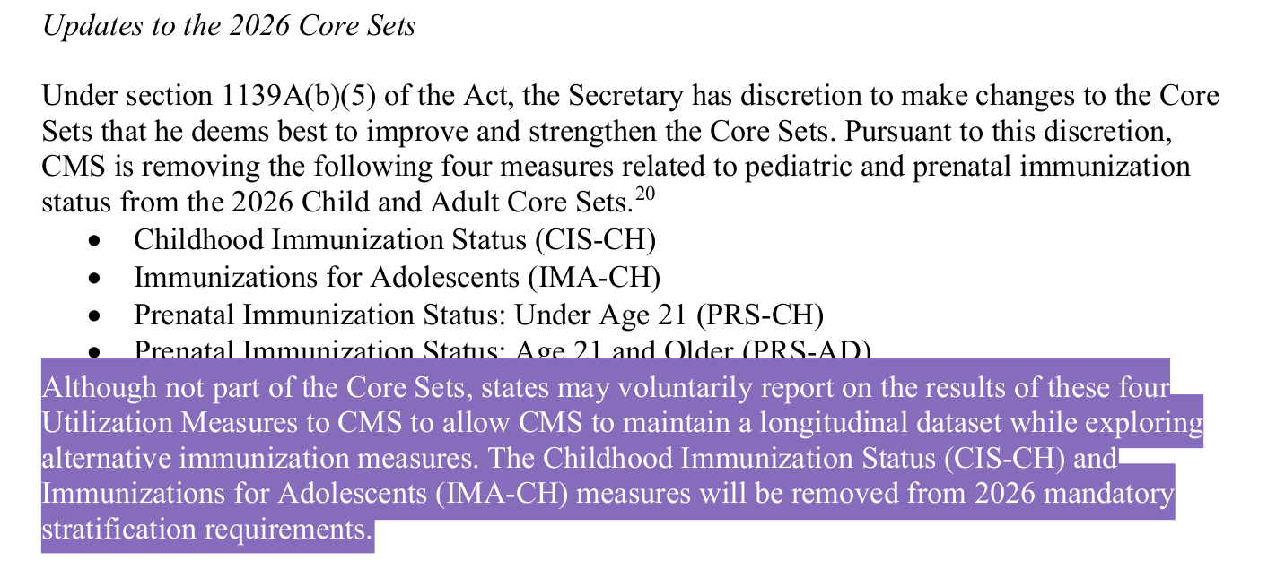 The number one reason for issuing this letter is to announce the removal of tracking vaccinations and vaccination status for children and pregnant women under the Medicaid and CHIP programs. States may continue to voluntarily report on these data sets. The announcement does not remove incentivization programs at the state level. Some of those incentivization programs include the Meaningful Use Program and Social Determinants of Health or SDOH. No matter what policy is updated or changed, I still find the incentivization programs remain.