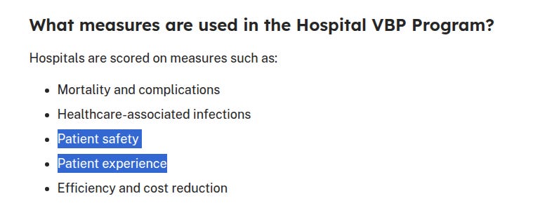 Patient safety is the one where they bury the employee Covid-19 and flu vaccination core measure. It’s under safety because their rational is to keep patients safe from infection while hospitalized, the staff must be vaccinated. The concept of natural immunity doesn’t even enter the equation. People who have not been vaccinated have 15 times (heard that number somewhere) less chance of getting Covid but that doesn’t matter to the Medical Cult. CMS is not concerned with shedding either, just germ transmission (isn’t it the same thing?) This is why during the scamdemic each day the hospital admin sent notifications that remote staff weren’t taking their shots and we were grandma killers. Not getting our shots fast enough made our hospital score look bad by comparison to other institut. Since the hospital’s success or failure rides on the vaccination choices of their collective staff, it discourages individual choice. The VBP program is the reason why hospitals have been so feirce at firing employees who submit exemptions. To this day, health care providers remain selective about hiring people with vaccination exemptions.