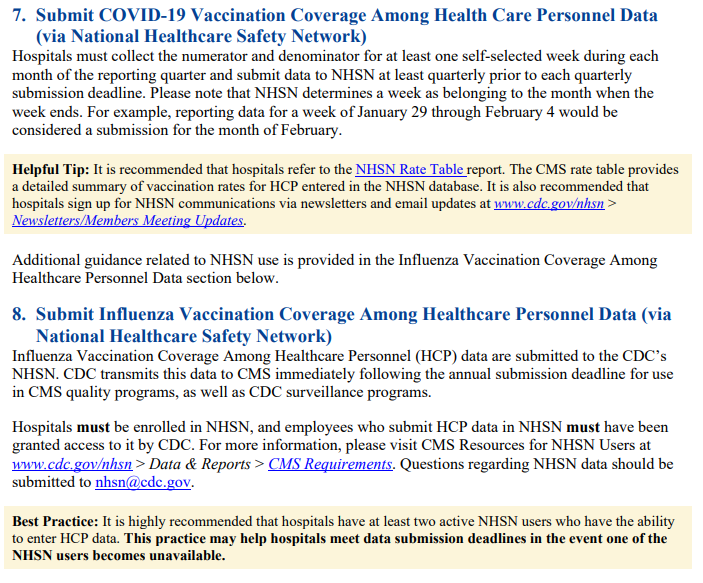 This program is the reason why I had to quit my job in 2021. It is the reason why healthcare workers have been mandated to get vaccines as a condition of employment for over a decade. The policy comes from Medicare. It is not the hospital’s making the policy on their own. Any health care entity that is billing to Medicare is subject to this vaccination incentive policy. The policy still stands. I just checked and the VBP program is still in effect. Under this policy, any health care entity that is part of Medicare or Medicaid, must report flu and COVID-19 vaccination status for employees as a condition of payment. The vaccination status of children is also tracked through the Medicaid and CHIP programs. Providers in the program are incentivized to report vaccinations and vaccine status in the same way.
