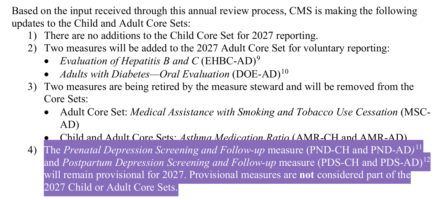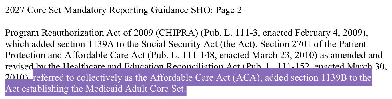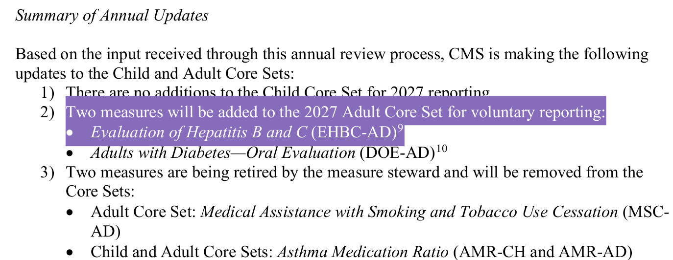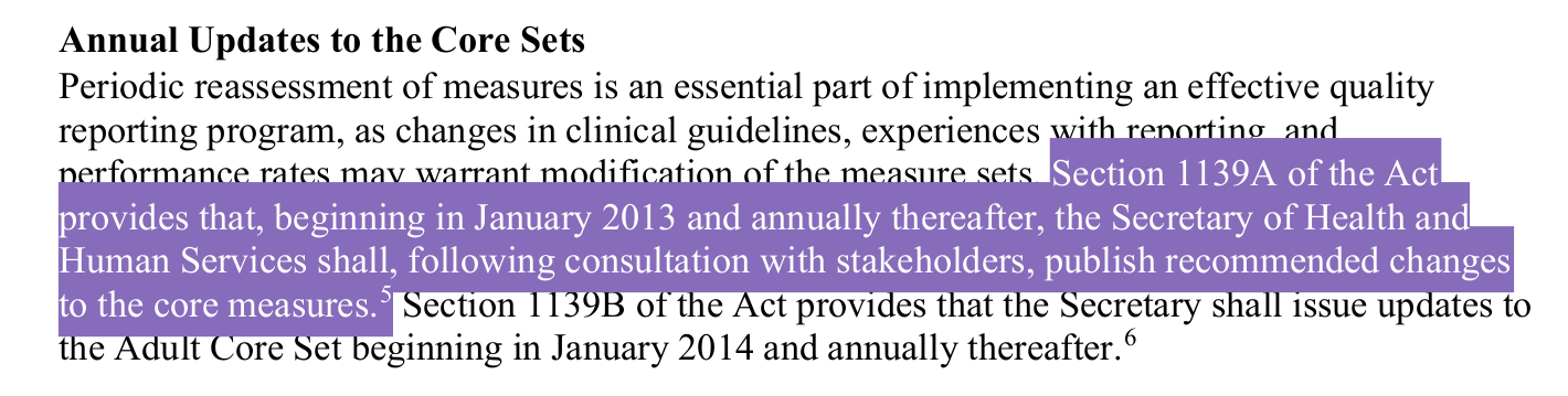 On page two, you can see this policy was born under the Affordable Care Act. Adult and child core sets were updated because they are following the health of children all the way through adulthood in the Medicaid program. For those who don’t know, Medicare is typically for patients over 65, and Medicaid is for patients who are under age 65 with no other insurance. Medicaid and CHIP are both programs for otherwise uninsured people under age 65, including children. It is a way to provide insurance for those who don’t have it.